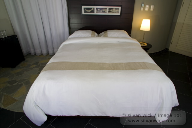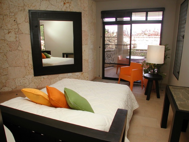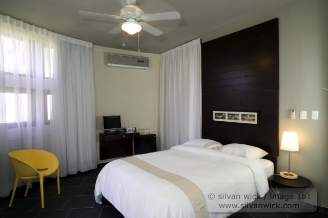 - Una habitación con cama grande (tamaño “Queen”), aire acondicionado y baño completo integrado