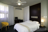 Una habitación con cama Queen, aire acondicionado y baño completo integrado